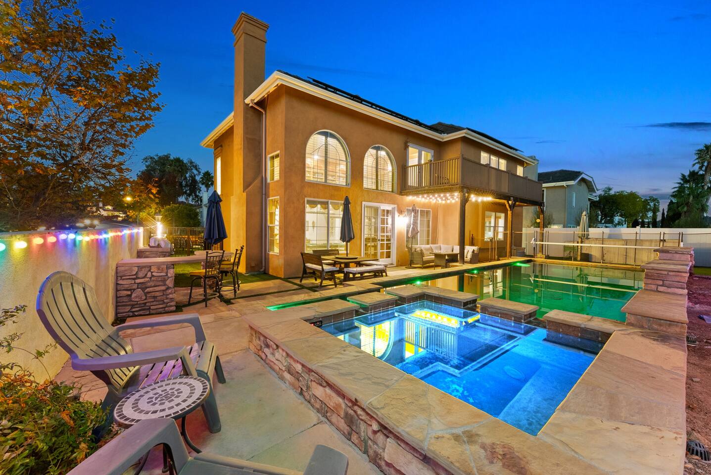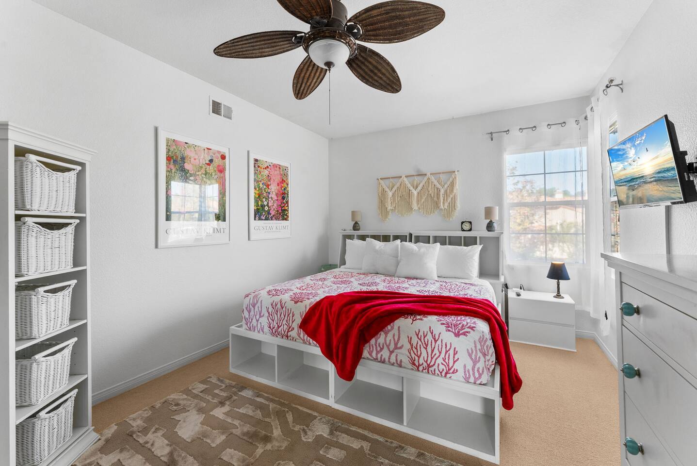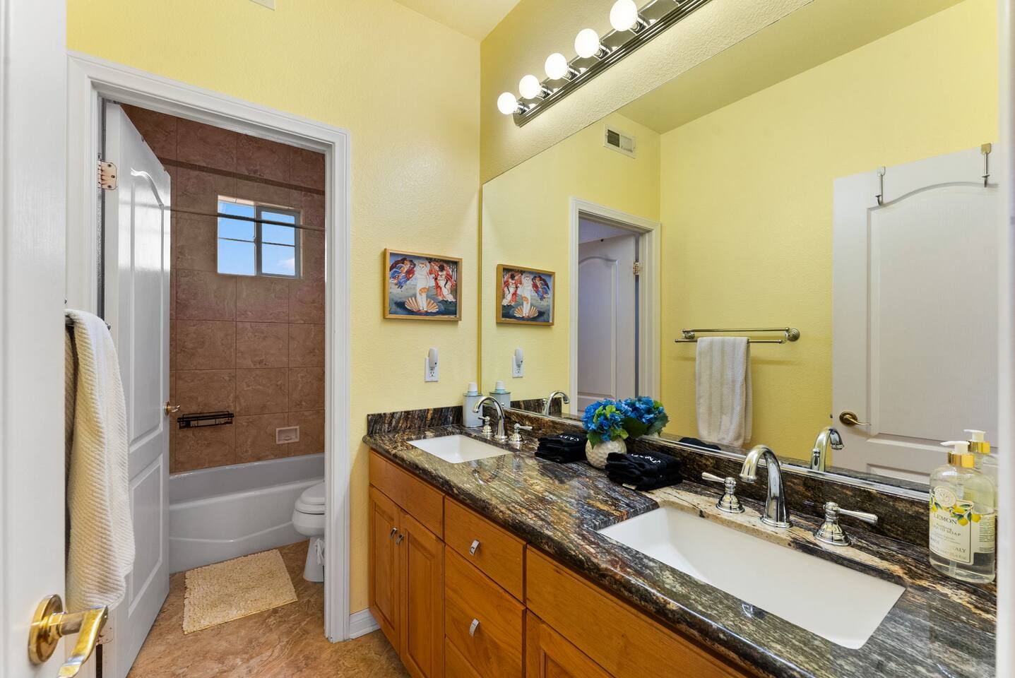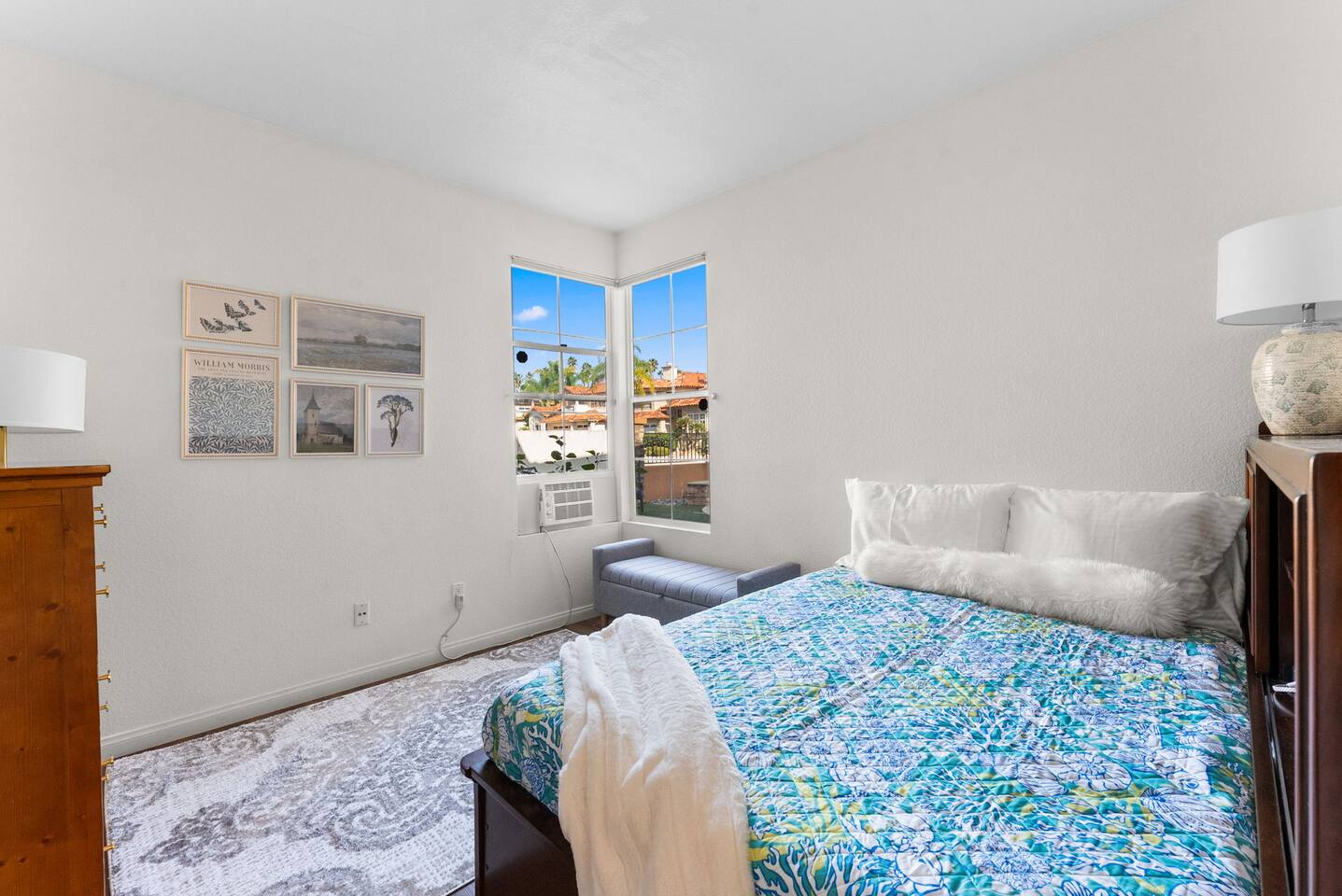 Welcome to your Carmel Valley retreat, a spacious villa designed for families and friends who want to enjoy the best of San Diego in comfort and style. Perfectly located near Del Mar and just a minute from the freeway, this home makes it easy to explore the beaches, downtown, the Zoo, and everything in between—while still offering the peace and quiet of a beautiful neighborhood on a corner lot. Step inside and you’ll immediately feel at home. The downstairs game parlor sets the tone for fun with a convertible pool-and-ping-pong table and a flat-screen TV for game nights. From there, step outside to your private backyard oasis—complete with a sparkling pool, hot tub, outdoor dining area, built-in BBQ, and a separate dog-run and play zone for your furry companions. At night, the pool lights up for a magical swim under the stars. The fenced pool area and alarm system add peace of mind for families with little ones. Back inside, mix a drink at the built-in bar, or whip up a meal in the chef’s kitchen, stocked with everything you need for cooking and entertaining. The living area invites relaxation with its oversized sofa, smart TV, and even a VHS player with nostalgic kids’ movies for a little retro fun. You’ll also find a laundry area, half bath, and a bedroom with an ensuite bathroom downstairs—perfect for guests who prefer to avoid stairs. Sleeping Arrangements Upstairs Bedroom 1 - Primary Suite: King bed, ensuite bath, large closet (great for infant sleep setup with Pack ’n Play) Bedroom 2: King bed with TV and dresser Bedroom 3: Two twin beds (one trundle, can combine into large bed or lower for toddlers) Bedroom 4: Playroom with full-size crib, toys, books, and blackout shades Downstairs Bedroom 5: Queen bed with ensuite bathroom Head upstairs to the library loft, where books, board games, and even a keyboard piano await. It’s the perfect spot to unwind, learn something new, or get cozy with a book. A dedicated workspace nearby makes remote work a breeze—because someone’s got to fund the fun, right? Out front, enjoy your private front yard with seating and a built-in fire pit, ideal for evening conversations under the California sky. Between the driveway parking, ample street parking, and family-friendly neighborhood, you’ll have all the convenience and comfort of home—just minutes from it all. This home is all about space, comfort, and connection. It’s well-made, beautifully designed, and ready for families who want to swim, play, relax, and make lasting memories together.