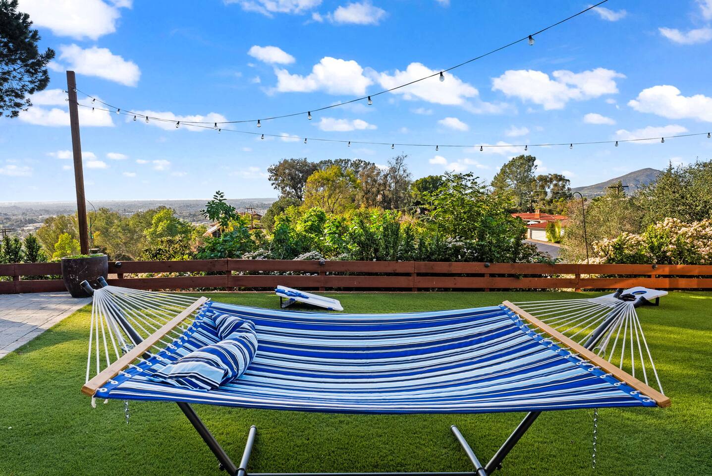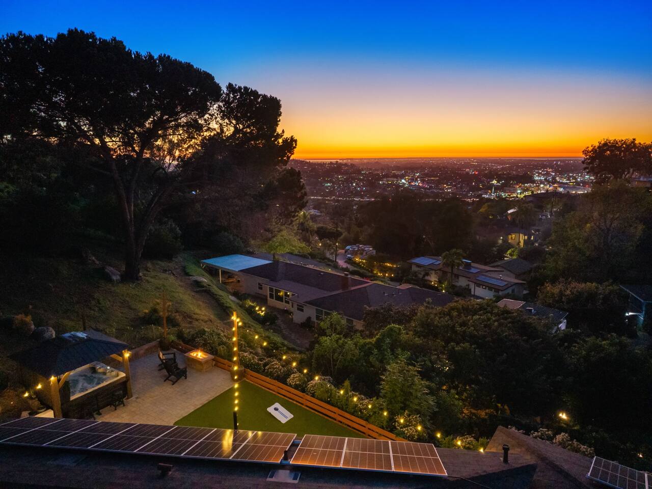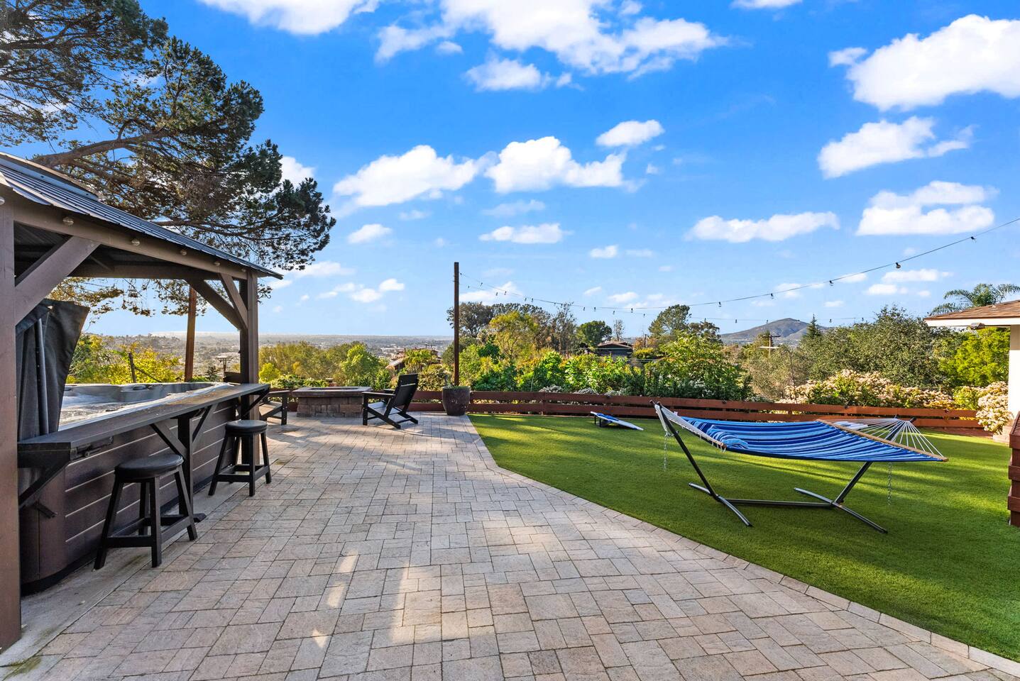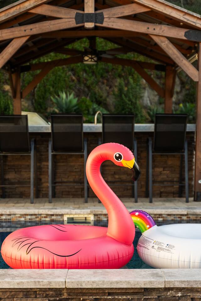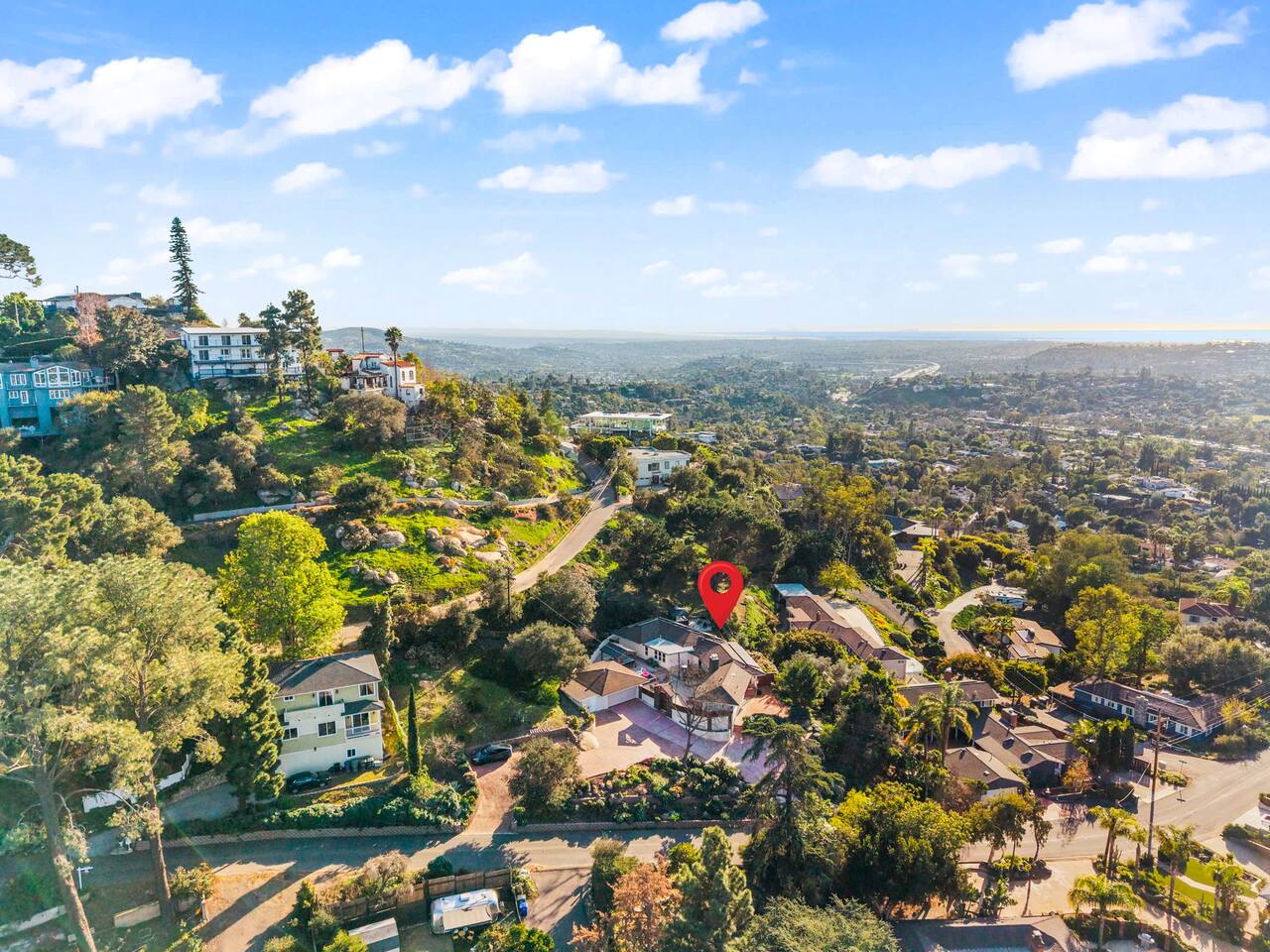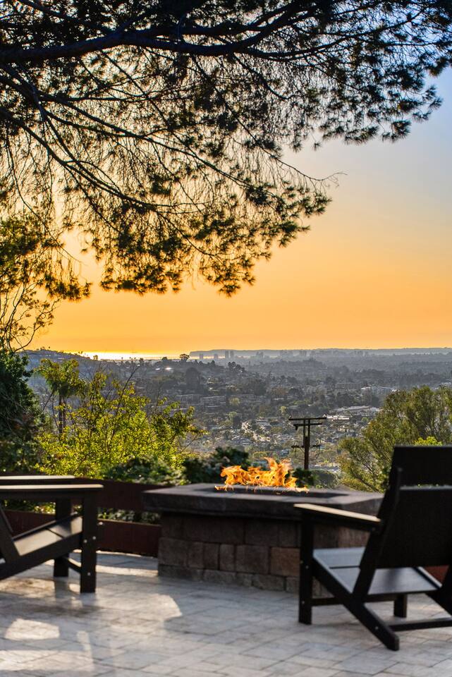 High above San Diego, where the city feels quieter and the views stretch all the way to the ocean on a clear day, this Mt. Helix retreat is designed for unforgettable family time. From the moment you arrive, life slows down. Mornings begin with coffee and sweeping views. Afternoons turn playful and sun-soaked. Evenings glow with firelight, warm water, and long conversations under the stars. The home offers two distinct outdoor spaces, each intentionally designed for a different kind of experience. The courtyard is the social heart of the home. Here you’ll find the refreshing dipping pool—perfect for cooling off on hot summer days—alongside the outdoor kitchen and dining area. Gather for meals, grill together, and wind down by the outdoor fireplace as the sky changes color. It’s an inviting, central space made for togetherness. The backyard is all about relaxing and taking in the view. Sink into the hot tub once the sun goes down or during cooler winter nights, sway in the hammock, or challenge each other to a game of cornhole. End the night around the view fire pit, watching the lights of San Diego sparkle below. Inside, the garage has been transformed into a full game room that’s a hit with both kids and adults. Settle in for movie nights with a projector and cozy seating (complete with a popcorn machine), test your skills with axe throwing, or rotate between mini pool, air hockey, and ping pong on the convertible game table. Board games round out the fun for rainy days or late-night laughs. The home is thoughtfully laid out to balance shared moments with privacy—ideal for families and multi-generational stays. Sleeping arrangements: Bedroom 1: King bed, twin pull-out sofa, crib tucked into the walk-in closet area, and private ensuite bathroom Bedroom 2: Queen bed with a full-size loft bed—perfect for kids Bedroom 3: King bed with private ensuite bathroom An additional full bathroom with a shower is located just off the kitchen and offers direct outdoor access, making it the perfect pool bath. Though the home feels private and tucked away at the top of Mt. Helix, you’re less than five minutes from the freeway—making it easy to reach beaches, attractions, and everything San Diego has to offer. This home was made for family fun—sunny days, cozy nights, and memories that last long after checkout.