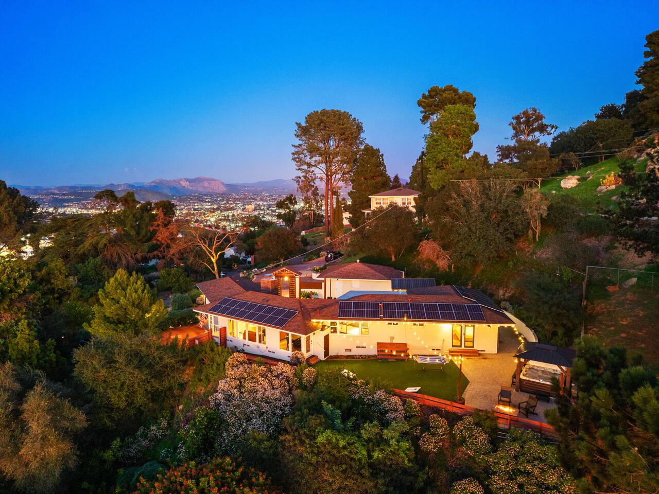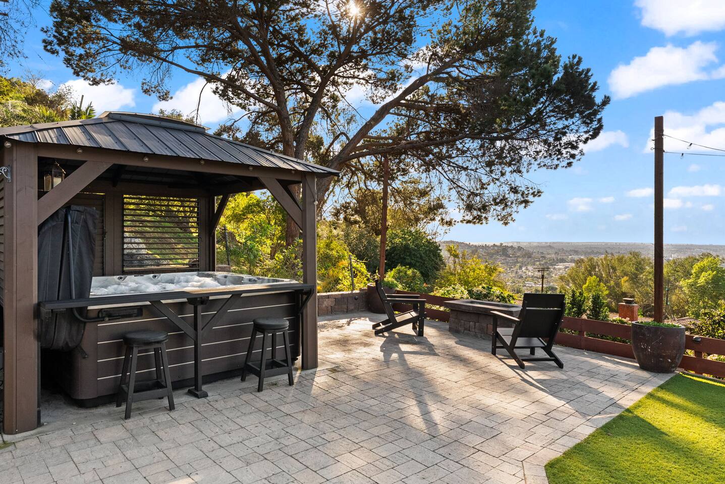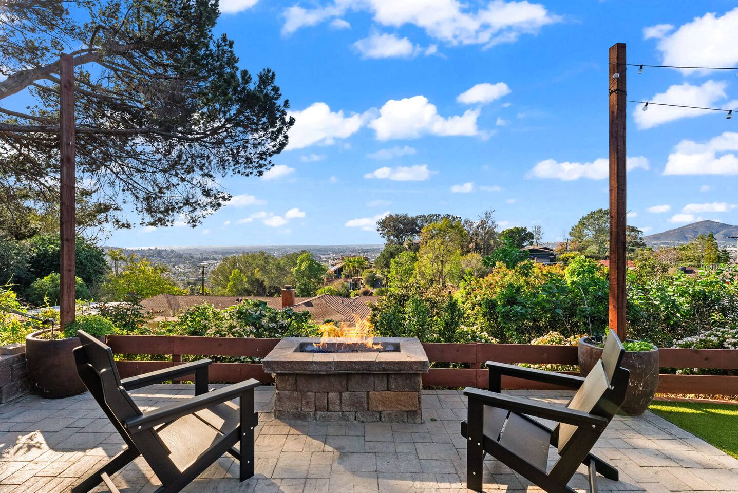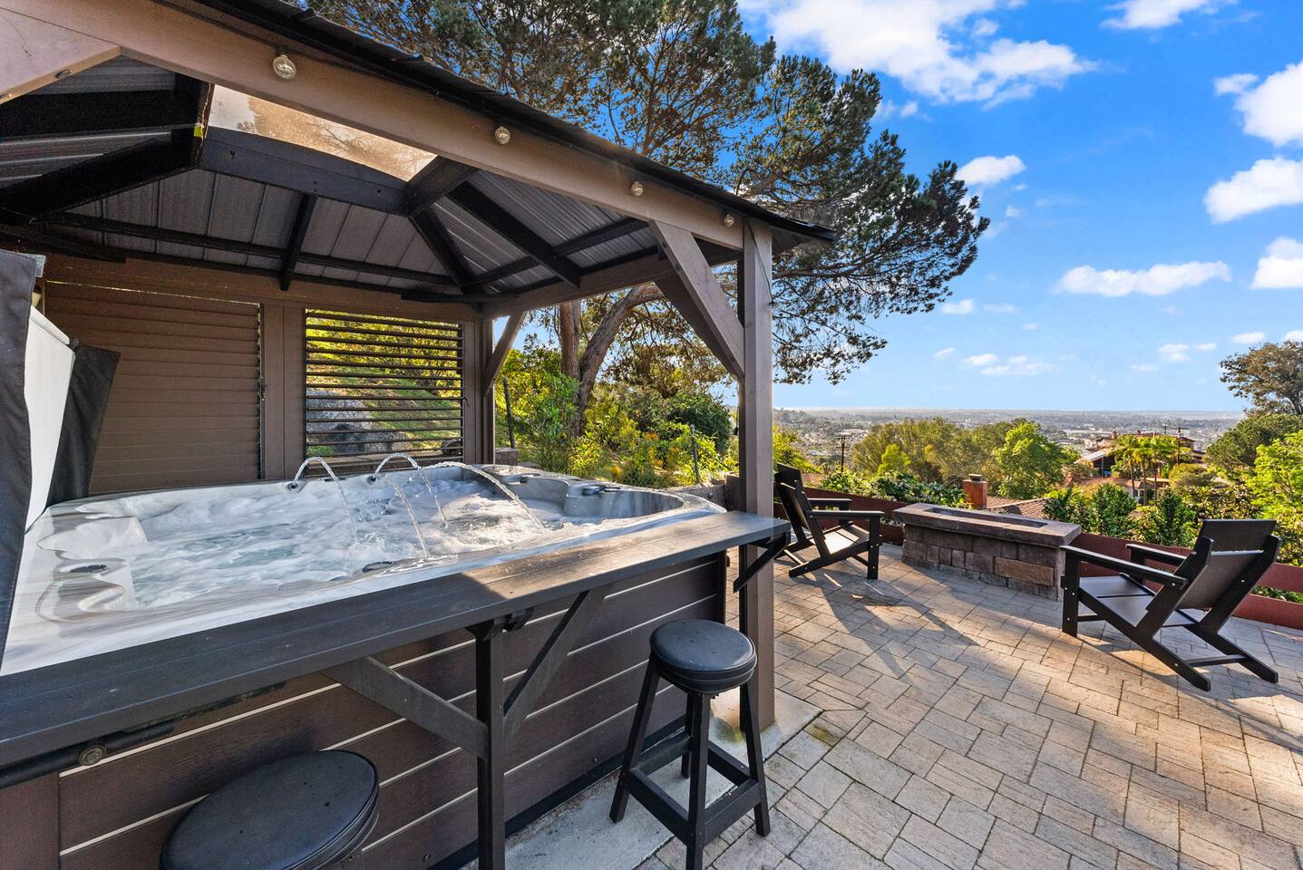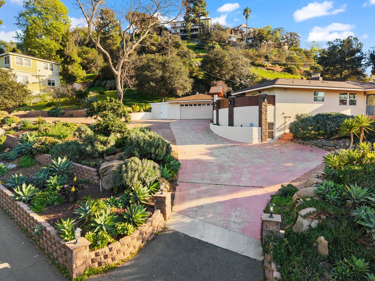High above San Diego, where the city feels quieter and the views stretch all the way to the ocean on a clear day, this Mt. Helix retreat is designed for unforgettable family time. From the moment you arrive, life slows down. Mornings begin with coffee and sweeping views. Afternoons turn playful and sun-soaked. Evenings glow with firelight, warm water, and long conversations under the stars. The home offers two distinct outdoor spaces, each intentionally designed for a different kind of experience. The courtyard is the social heart of the home. Here you’ll find the refreshing dipping pool—perfect for cooling off on hot summer days—alongside the outdoor kitchen and dining area. Gather for meals, grill together, and wind down by the outdoor fireplace as the sky changes color. It’s an inviting, central space made for togetherness. The backyard is all about relaxing and taking in the view. Sink into the hot tub once the sun goes down or during cooler winter nights, sway in the hammock, or challenge each other to a game of cornhole. End the night around the view fire pit, watching the lights of San Diego sparkle below. Inside, the garage has been transformed into a full game room that’s a hit with both kids and adults. Settle in for movie nights with a projector and cozy seating (complete with a popcorn machine), test your skills with axe throwing, or rotate between mini pool, air hockey, and ping pong on the convertible game table. Board games round out the fun for rainy days or late-night laughs. The home is thoughtfully laid out to balance shared moments with privacy—ideal for families and multi-generational stays. Sleeping arrangements: Bedroom 1: King bed, twin pull-out sofa, crib tucked into the walk-in closet area, and private ensuite bathroom Bedroom 2: Queen bed with a full-size loft bed—perfect for kids Bedroom 3: King bed with private ensuite bathroom An additional full bathroom with a shower is located just off the kitchen and offers direct outdoor access, making it the perfect pool bath. Though the home feels private and tucked away at the top of Mt. Helix, you’re less than five minutes from the freeway—making it easy to reach beaches, attractions, and everything San Diego has to offer. This home was made for family fun—sunny days, cozy nights, and memories that last long after checkout.