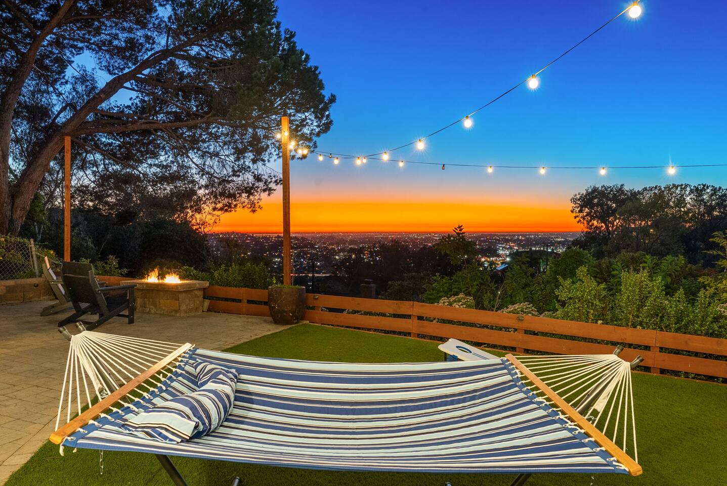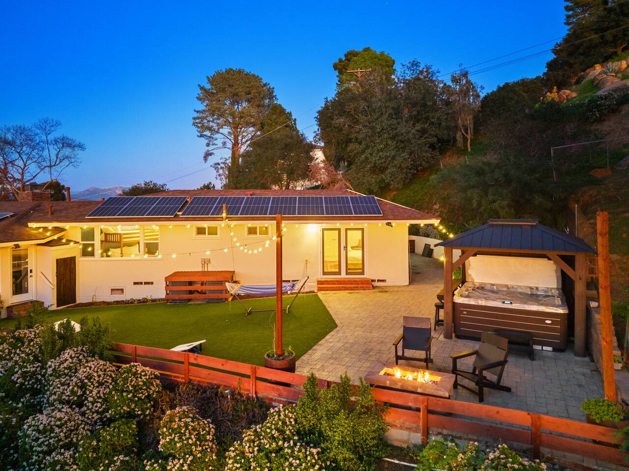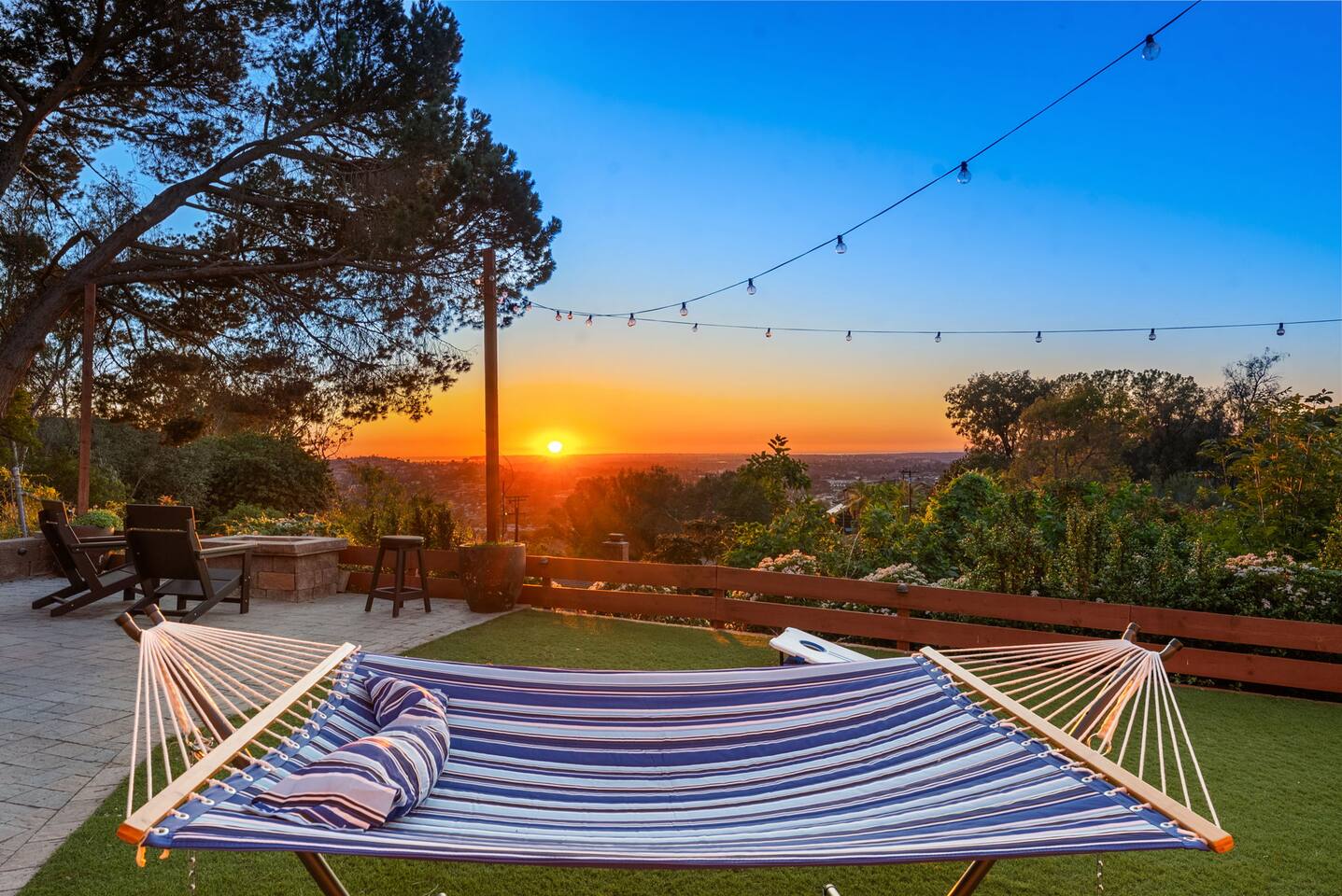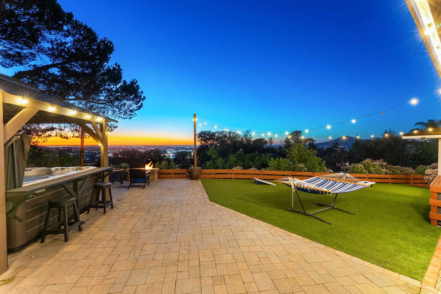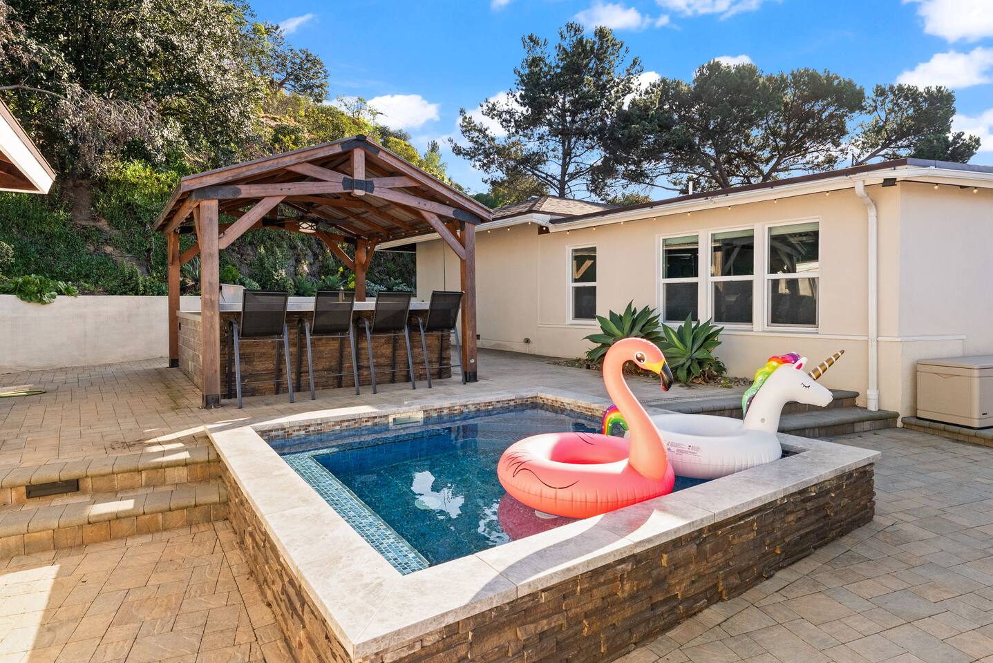 High above San Diego, where the city feels quieter and the views stretch all the way to the ocean on a clear day, this Mt. Helix retreat is designed for unforgettable family time. From the moment you arrive, life slows down. Mornings begin with coffee and sweeping views. Afternoons turn playful and sun-soaked. Evenings glow with firelight, warm water, and long conversations under the stars. The home offers two distinct outdoor spaces, each intentionally designed for a different kind of experience. The courtyard is the social heart of the home. Here you’ll find the refreshing dipping pool—perfect for cooling off on hot summer days—alongside the outdoor kitchen and dining area. Gather for meals, grill together, and wind down by the outdoor fireplace as the sky changes color. It’s an inviting, central space made for togetherness. The backyard is all about relaxing and taking in the view. Sink into the hot tub once the sun goes down or during cooler winter nights, sway in the hammock, or challenge each other to a game of cornhole. End the night around the view fire pit, watching the lights of San Diego sparkle below. Inside, the garage has been transformed into a full game room that’s a hit with both kids and adults. Settle in for movie nights with a projector and cozy seating (complete with a popcorn machine), test your skills with axe throwing, or rotate between mini pool, air hockey, and ping pong on the convertible game table. Board games round out the fun for rainy days or late-night laughs. The home is thoughtfully laid out to balance shared moments with privacy—ideal for families and multi-generational stays. Sleeping arrangements: Bedroom 1: King bed, twin pull-out sofa, crib tucked into the walk-in closet area, and private ensuite bathroom Bedroom 2: Queen bed with a full-size loft bed—perfect for kids Bedroom 3: King bed with private ensuite bathroom An additional full bathroom with a shower is located just off the kitchen and offers direct outdoor access, making it the perfect pool bath. Though the home feels private and tucked away at the top of Mt. Helix, you’re less than five minutes from the freeway—making it easy to reach beaches, attractions, and everything San Diego has to offer. This home was made for family fun—sunny days, cozy nights, and memories that last long after checkout.
