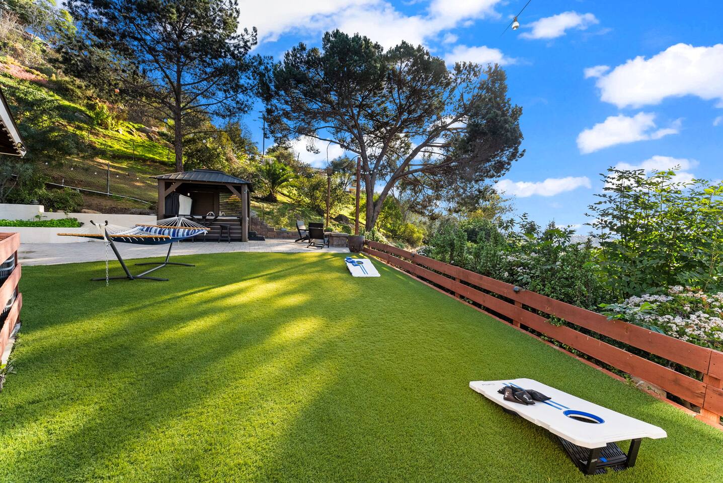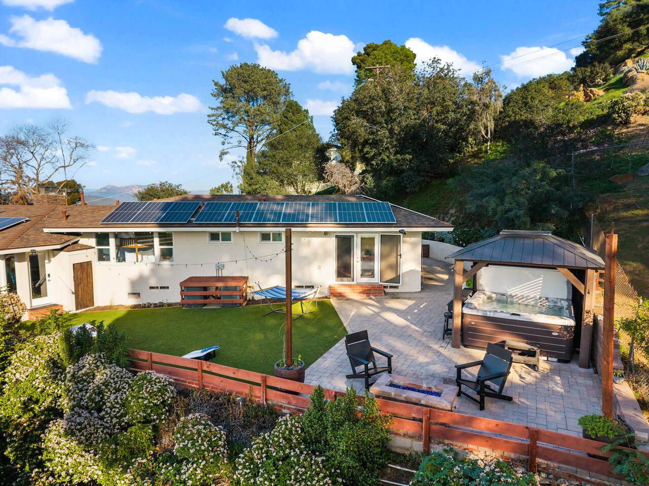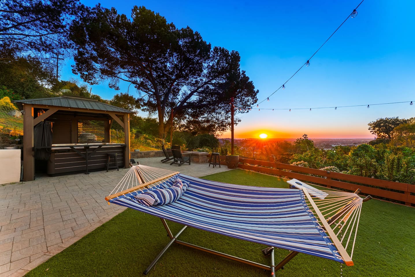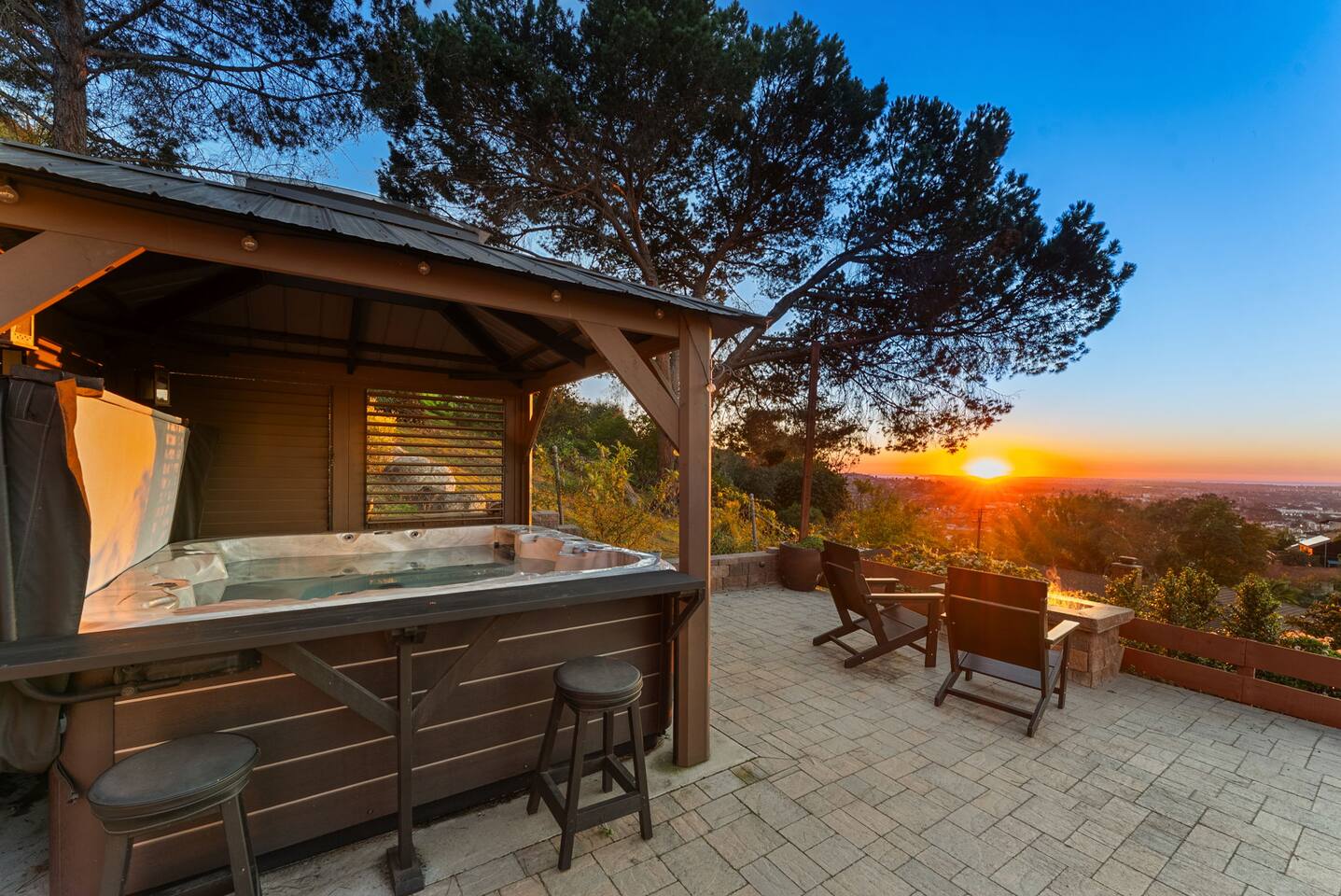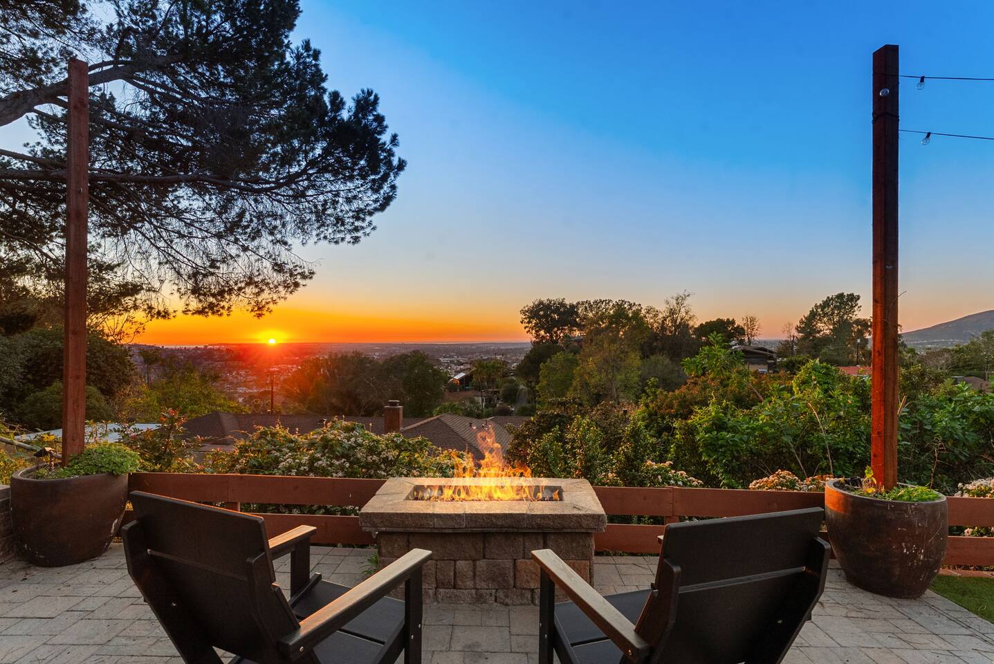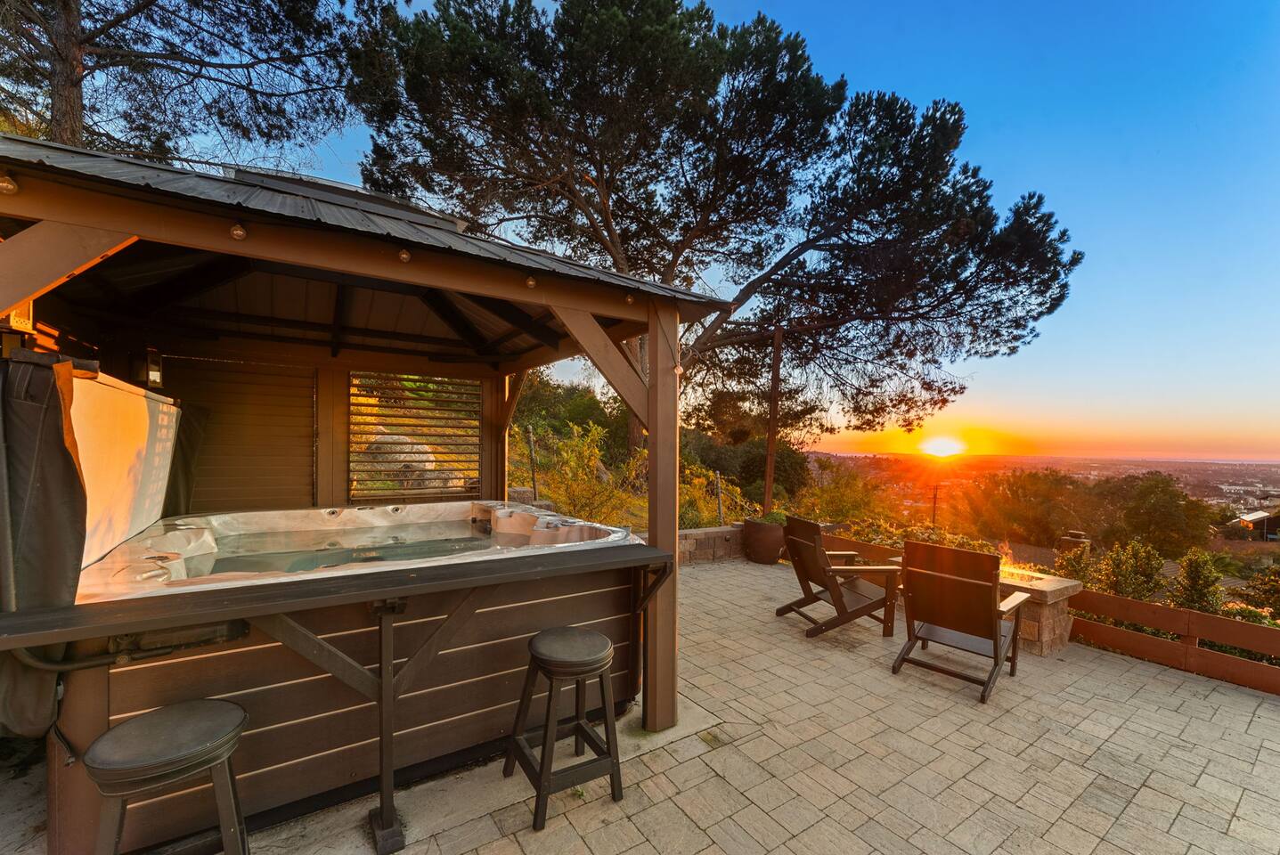 High above San Diego, where the city feels quieter and the views stretch all the way to the ocean on a clear day, this Mt. Helix retreat is designed for unforgettable family time. From the moment you arrive, life slows down. Mornings begin with coffee and sweeping views. Afternoons turn playful and sun-soaked. Evenings glow with firelight, warm water, and long conversations under the stars. The home offers two distinct outdoor spaces, each intentionally designed for a different kind of experience. The courtyard is the social heart of the home. Here you’ll find the refreshing dipping pool—perfect for cooling off on hot summer days—alongside the outdoor kitchen and dining area. Gather for meals, grill together, and wind down by the outdoor fireplace as the sky changes color. It’s an inviting, central space made for togetherness. The backyard is all about relaxing and taking in the view. Sink into the hot tub once the sun goes down or during cooler winter nights, sway in the hammock, or challenge each other to a game of cornhole. End the night around the view fire pit, watching the lights of San Diego sparkle below. Inside, the garage has been transformed into a full game room that’s a hit with both kids and adults. Settle in for movie nights with a projector and cozy seating (complete with a popcorn machine), test your skills with axe throwing, or rotate between mini pool, air hockey, and ping pong on the convertible game table. Board games round out the fun for rainy days or late-night laughs. The home is thoughtfully laid out to balance shared moments with privacy—ideal for families and multi-generational stays. Sleeping arrangements: Bedroom 1: King bed, twin pull-out sofa, crib tucked into the walk-in closet area, and private ensuite bathroom Bedroom 2: Queen bed with a full-size loft bed—perfect for kids Bedroom 3: King bed with private ensuite bathroom An additional full bathroom with a shower is located just off the kitchen and offers direct outdoor access, making it the perfect pool bath. Though the home feels private and tucked away at the top of Mt. Helix, you’re less than five minutes from the freeway—making it easy to reach beaches, attractions, and everything San Diego has to offer. This home was made for family fun—sunny days, cozy nights, and memories that last long after checkout.