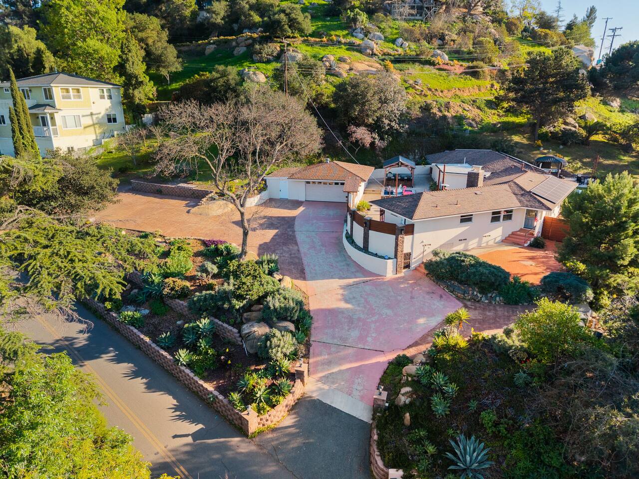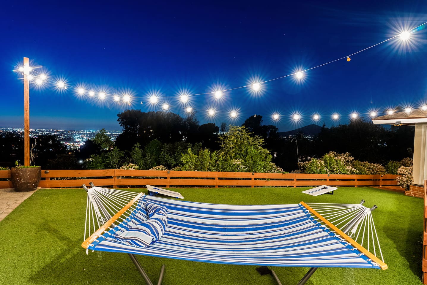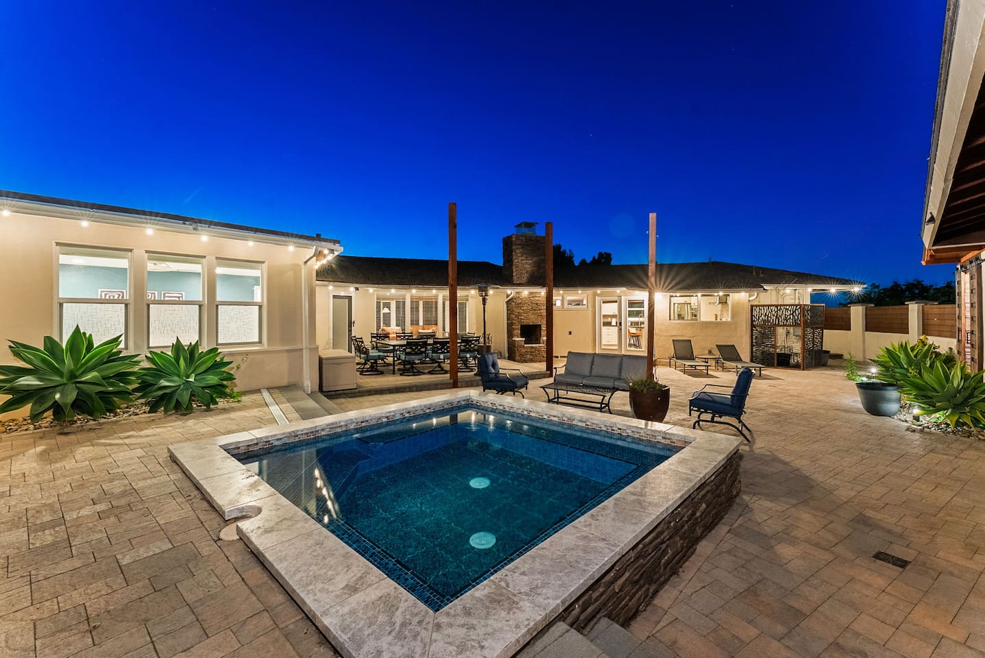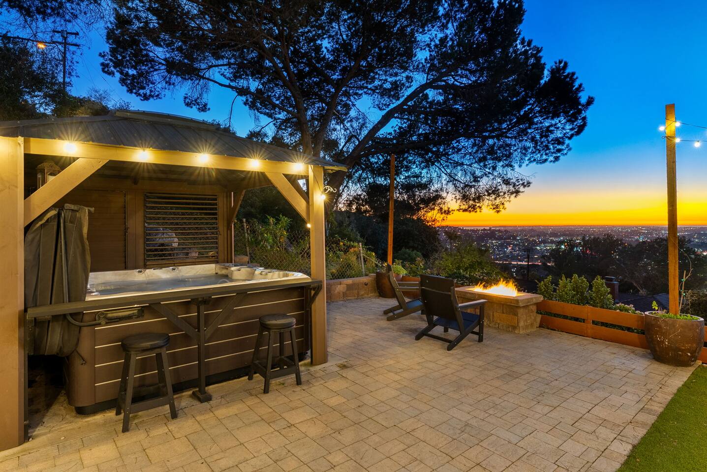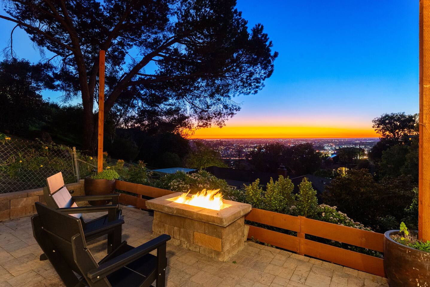 High above San Diego, where the city feels quieter and the views stretch all the way to the ocean on a clear day, this Mt. Helix retreat is designed for unforgettable family time. From the moment you arrive, life slows down. Mornings begin with coffee and sweeping views. Afternoons turn playful and sun-soaked. Evenings glow with firelight, warm water, and long conversations under the stars. The home offers two distinct outdoor spaces, each intentionally designed for a different kind of experience. The courtyard is the social heart of the home. Here you’ll find the refreshing dipping pool—perfect for cooling off on hot summer days—alongside the outdoor kitchen and dining area. Gather for meals, grill together, and wind down by the outdoor fireplace as the sky changes color. It’s an inviting, central space made for togetherness. The backyard is all about relaxing and taking in the view. Sink into the hot tub once the sun goes down or during cooler winter nights, sway in the hammock, or challenge each other to a game of cornhole. End the night around the view fire pit, watching the lights of San Diego sparkle below. Inside, the garage has been transformed into a full game room that’s a hit with both kids and adults. Settle in for movie nights with a projector and cozy seating (complete with a popcorn machine), test your skills with axe throwing, or rotate between mini pool, air hockey, and ping pong on the convertible game table. Board games round out the fun for rainy days or late-night laughs. The home is thoughtfully laid out to balance shared moments with privacy—ideal for families and multi-generational stays. Sleeping arrangements: Bedroom 1: King bed, twin pull-out sofa, crib tucked into the walk-in closet area, and private ensuite bathroom Bedroom 2: Queen bed with a full-size loft bed—perfect for kids Bedroom 3: King bed with private ensuite bathroom An additional full bathroom with a shower is located just off the kitchen and offers direct outdoor access, making it the perfect pool bath. Though the home feels private and tucked away at the top of Mt. Helix, you’re less than five minutes from the freeway—making it easy to reach beaches, attractions, and everything San Diego has to offer. This home was made for family fun—sunny days, cozy nights, and memories that last long after checkout.